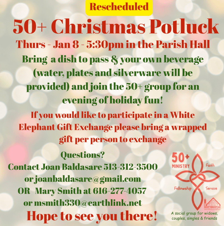 Potluck has been rescheduled for Thursday, Jan. 8, 2026 in the Parish Hall!